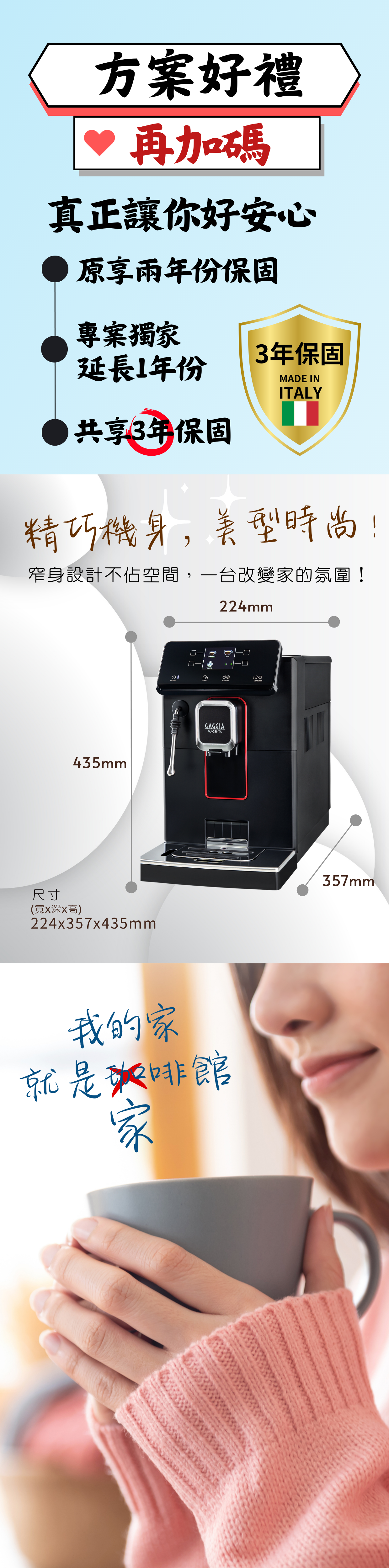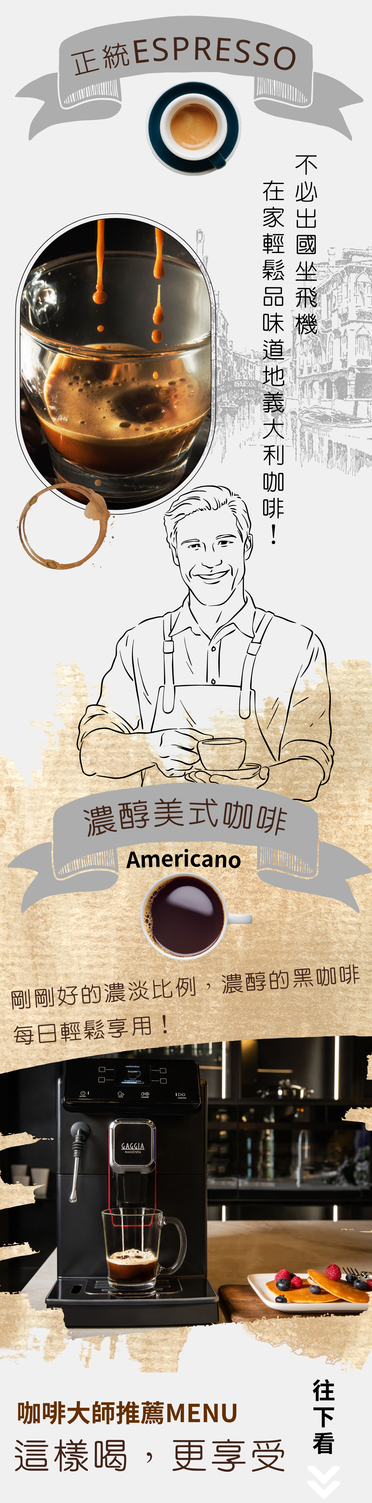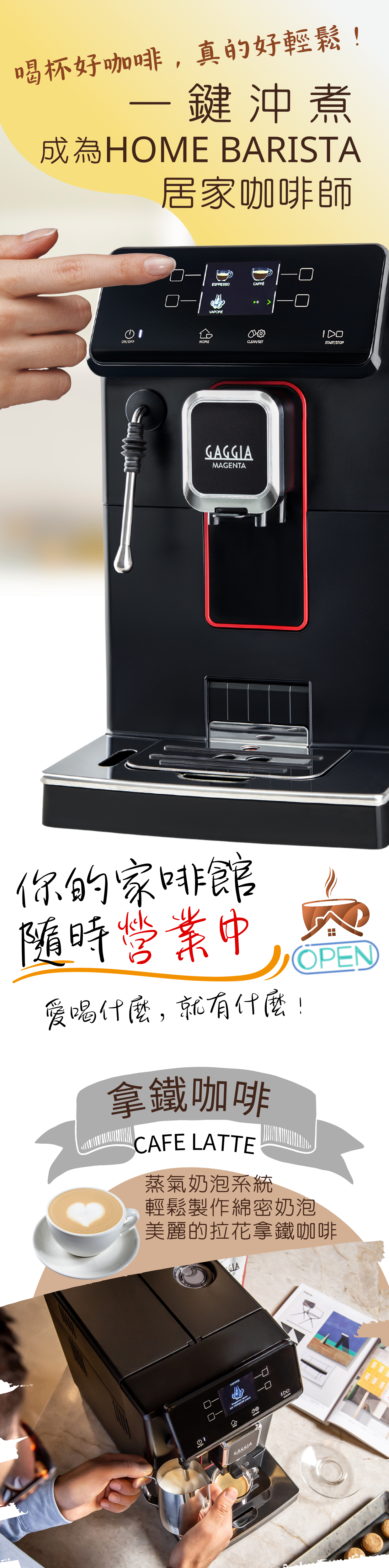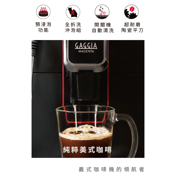 搭載同級唯一職人手作拉花系統,綿密卡布奇諾、拉花級拿鐵,皆能一手包辦。全新純粹美式咖啡功能,猶如咖啡廳正統製作手法,以濃縮咖啡及熱水分段沖煮,純淨明亮的口感,將全自動咖啡機層級再提升。義式咖啡機領航者,GAGGIA咖吉雅